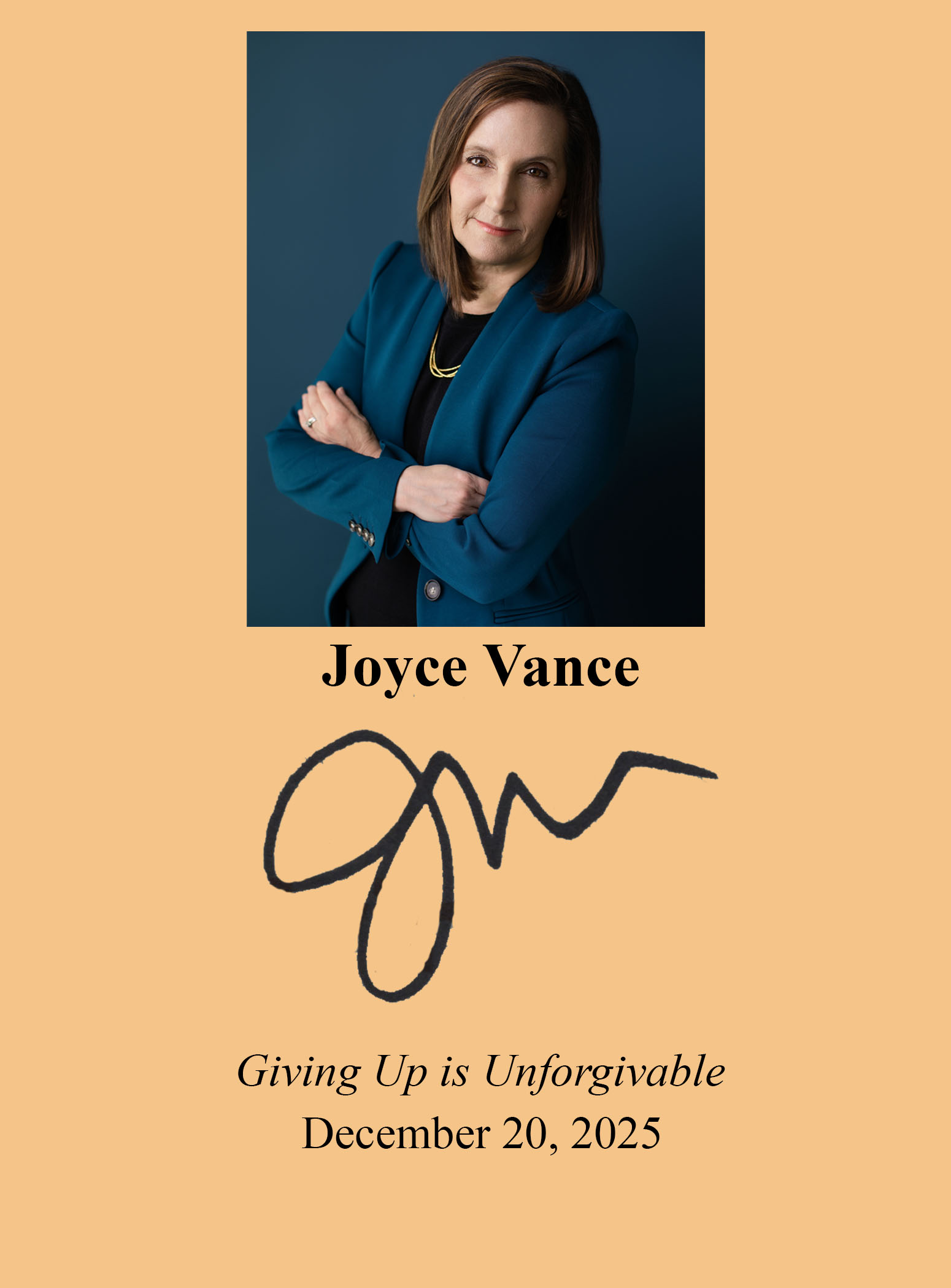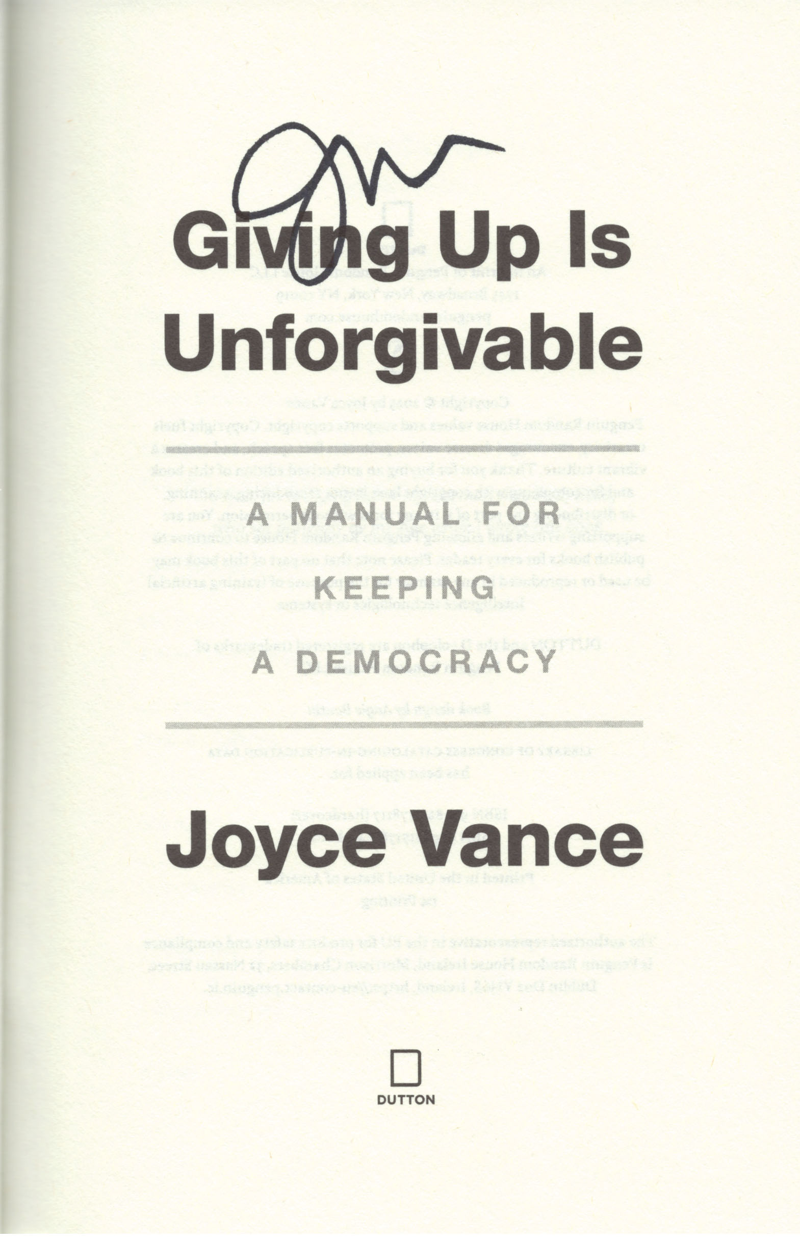 THIS COPY (shown below) was hand signed by Joyce Vance on the title page. It is a new, unread, unopened first edition hardback and comes with a certificate authenticating the signature. Published in October, 2025 by Dutton, an imprint of Penguin Random House.