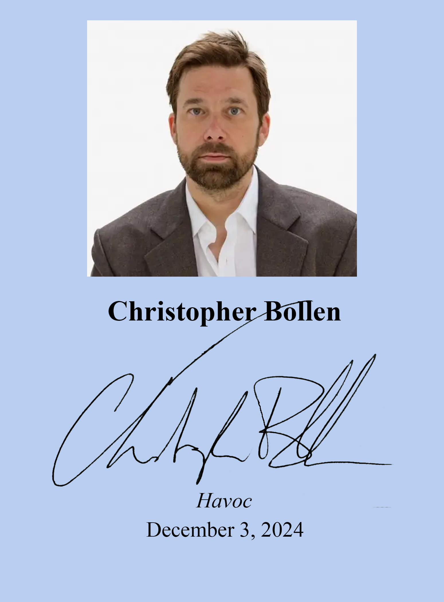 THIS COPY (shown below) was hand signed by Christopher Bollen on the title page. It is a new, unread, unopened first edition and comes with a certificate authenticating the signature. December, 2024 by Harper, an imprint of Harpercollins Publishers.