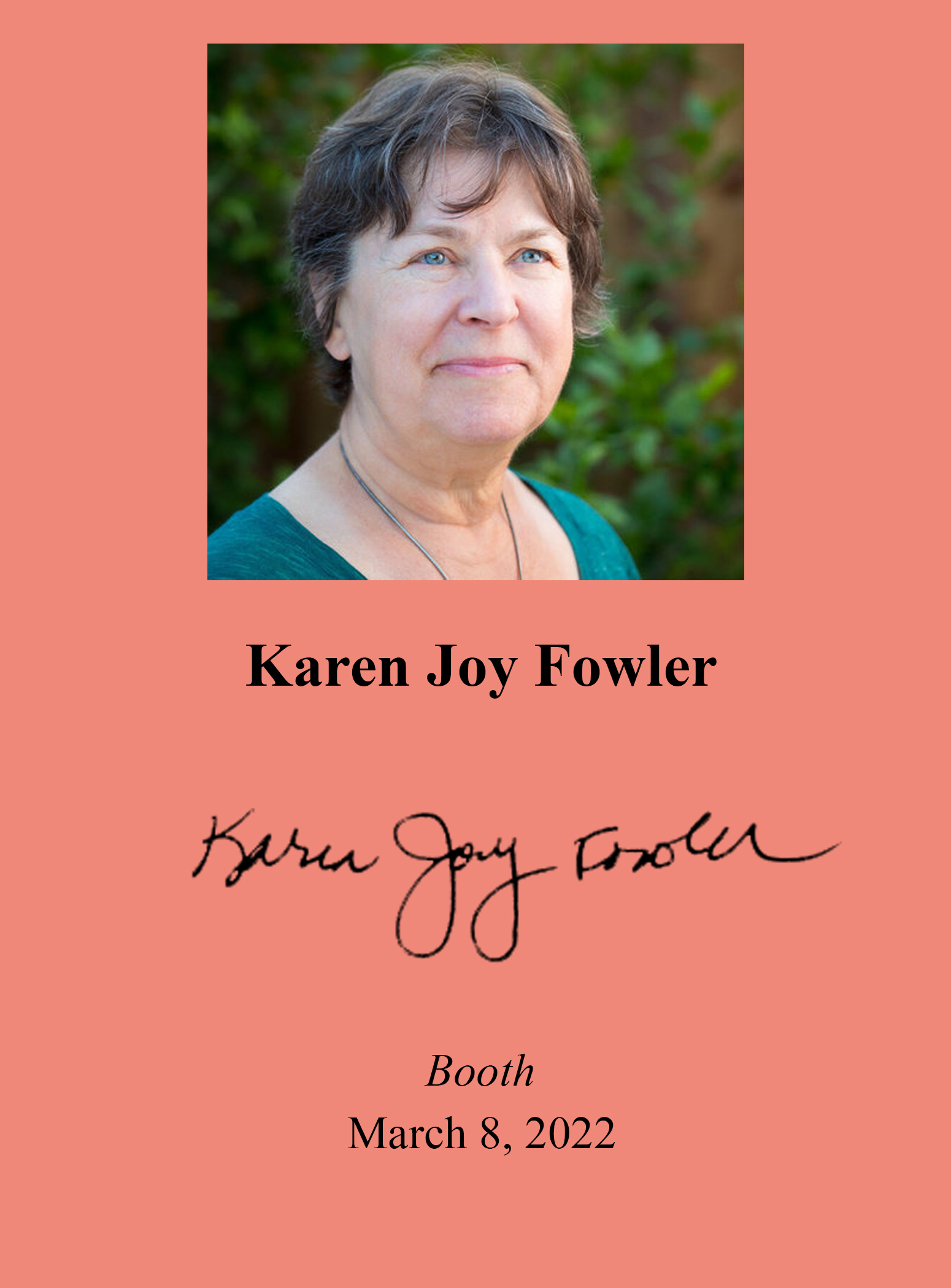 KAREN JOY FOWLER (pictured below from our Wall of Fame) is a Man Booker finalist and New York Times bestseller. Thank you Karen Joy Fowler for signing our books.
