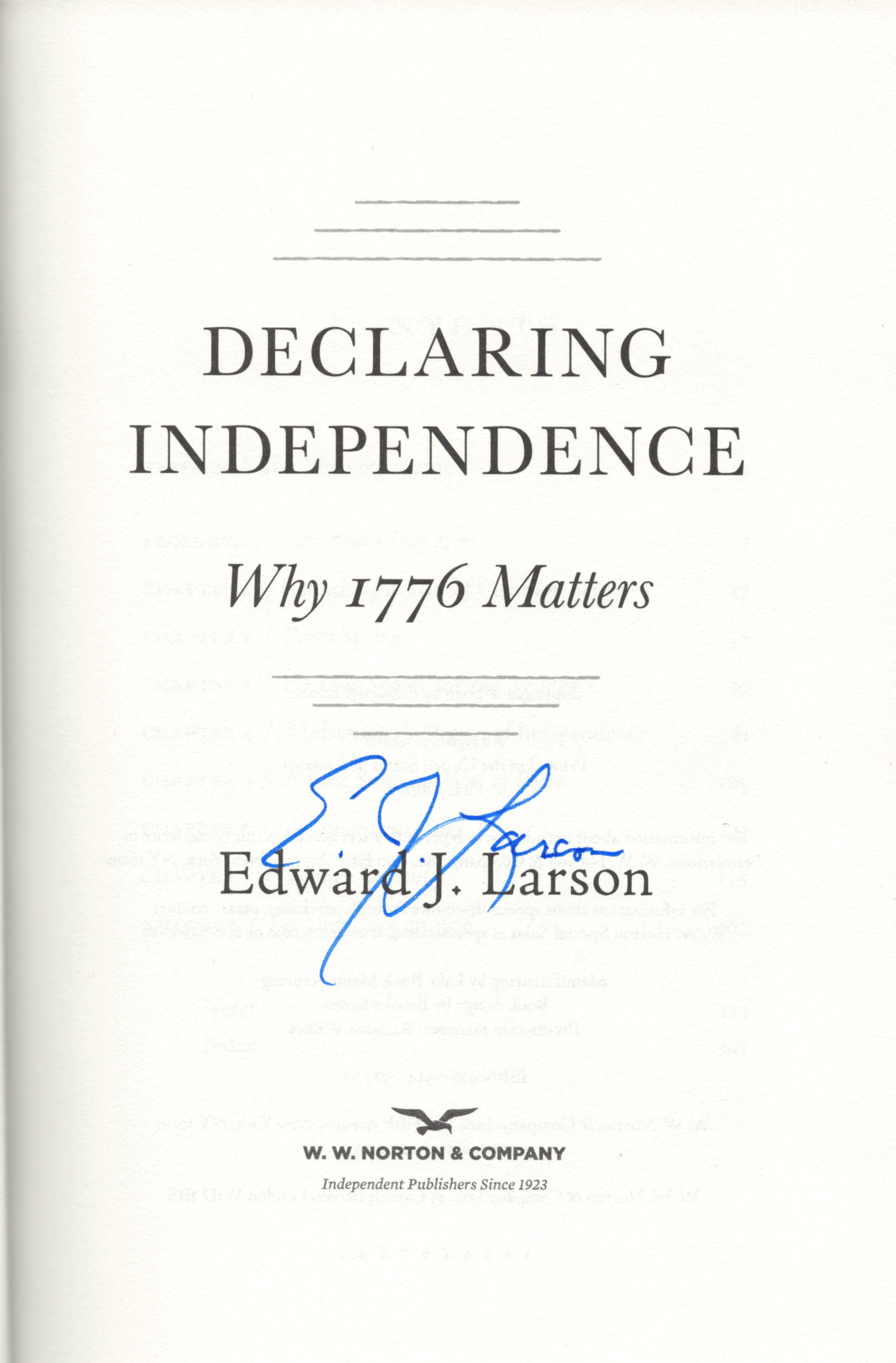 THIS COPY (shown below) was hand signed by Edward Larson on the title page. It is a new, unread, unopened first edition hardback and comes with a certificate authenticating the signature. Published in November, 2025 by the W.W. Norton Company.
